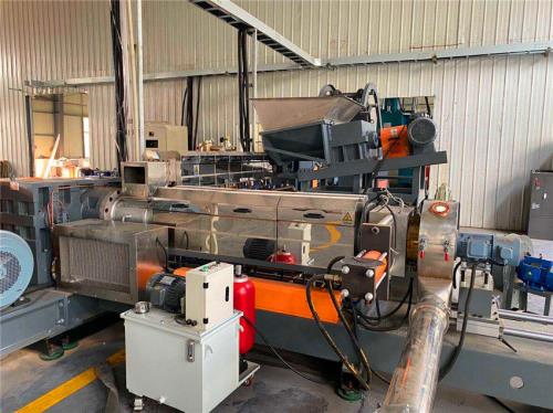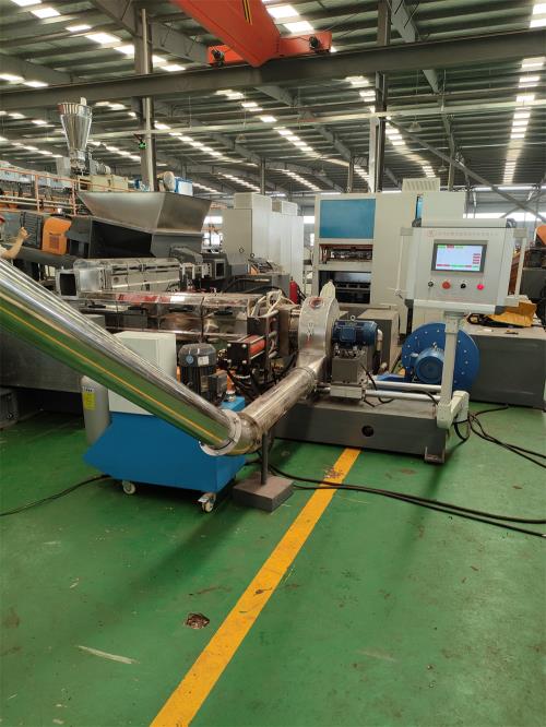 螺桿外表鍍硬鉻處理;2) 螺桿芯部采用通水冷卻4、料筒1)材質(zhì)為38CrMoALA氮化處理,氮化HV950-1050,深0.6-0.75mm,低煙無鹵造粒機脆性不大于II級;2)螺筒采用水冷卻;筒體上開槽,盤銅管,通冷卻水;螺筒上加防護罩,不銹鋼材質(zhì);3) 加熱區(qū)段:采用優(yōu)質(zhì)鑄鋁加熱器5、水冷卻系統(tǒng)1)水泵泵電機功率:1.5kw;自動控水電磁閥;手動閥用銅閘閥控制;加大水流量,2)采用環(huán)保風(fēng)冷卻系統(tǒng)(環(huán)保型:發(fā)明專利號:CN201911312134.6)不需要接外循環(huán)水冷卻6、液壓板式換網(wǎng)1)換網(wǎng)器,板式過濾自動換網(wǎng)器,流量截面為圓形;2)液壓缸、液壓站等一套,采用YA-N46抗磨46#液壓油;(油品需客戶自行采購)7、機頭裝置:1) 熱電偶與壓力傳感器分開安裝,分別用于檢測溫度和壓力(七)風(fēng)冷模面熱切輔機系統(tǒng)1)風(fēng)冷模面熱切造粒機:4級電機,功率1.5 kw;熱切刀一套、電機聯(lián)軸器一件,采用4把刀片切粒調(diào)速控制:采用“三晶或羅賓漢”變頻調(diào)速器2)切粒罩:對吹式,不銹鋼材質(zhì);一件;床身與切粒罩為整體式;推拉式結(jié)構(gòu);帶剎車裝置;熱切罩與機頭分離開有足夠空間;操作方便3)一級旋風(fēng)分離器:φ600mm,不銹鋼材質(zhì);一件;采用φ130mm不銹鋼管聯(lián)接;連接方式:5.5kw物料輸送風(fēng)機;低煙無鹵造粒機4)二級旋風(fēng)分離器:φ600mm,不銹鋼材質(zhì);一件;采用φ130mm不銹鋼管聯(lián)接,4kw物料輸送風(fēng)機;5)加長振動篩:一臺,L=2.5m,電機采用:震動專用電機;震動量可以調(diào)節(jié)大小:電機功率率:0.15KW兩臺;振動篩篩網(wǎng)采用三層分離物料;大孔直徑φ8mm,小孔直徑φ2.5mm,不銹鋼材質(zhì),6)三級旋風(fēng)分離器:φ600mm,不銹鋼材質(zhì);一件;采用φ130mm不銹鋼管聯(lián)接;連接方式:5.5kw物料輸送風(fēng)機;7)風(fēng)吹成品料倉:一套,1m料倉一件,不銹鋼材質(zhì);采用φ130mm不銹鋼管聯(lián)接;4kw物料輸送風(fēng)機;